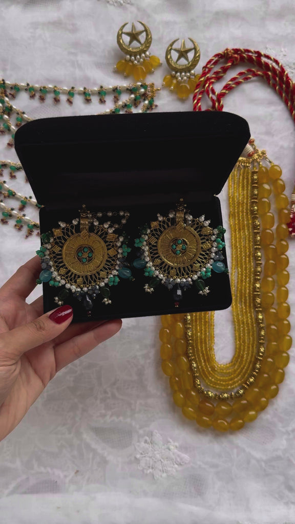Made with an old Afghan piece. Embellished with Lapis and Turquoise stones. At handcraftjewellery.pk, you'll discover an enticing array of Afghan earrings, each a unique masterpiece in its own right. These earrings are the epitome of fine craftsmanship, embodying the intricate artistry and attention to detail that Afghanistan is renowned for.